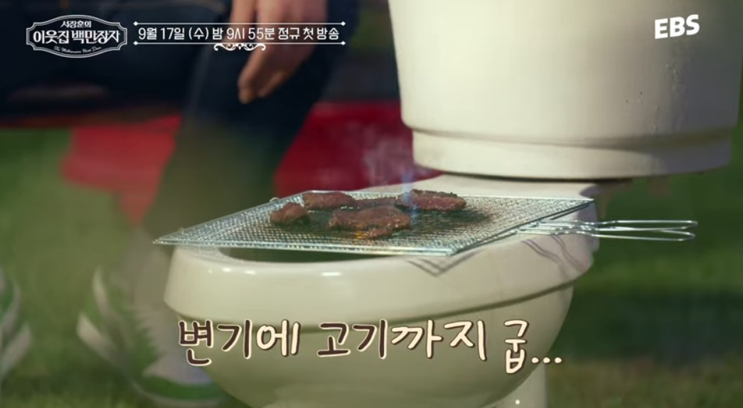 이어 충격적인 장면이 펼쳐졌다. '연예계 대표 깔끔 대마왕' 서장훈이 무려 양변기를 목에 걸고 등장한 것. 심지어 양변기에 고기를 구워 먹는 파격적인 퍼포먼스까지 펼쳐져 모두를 경악하게 했다.