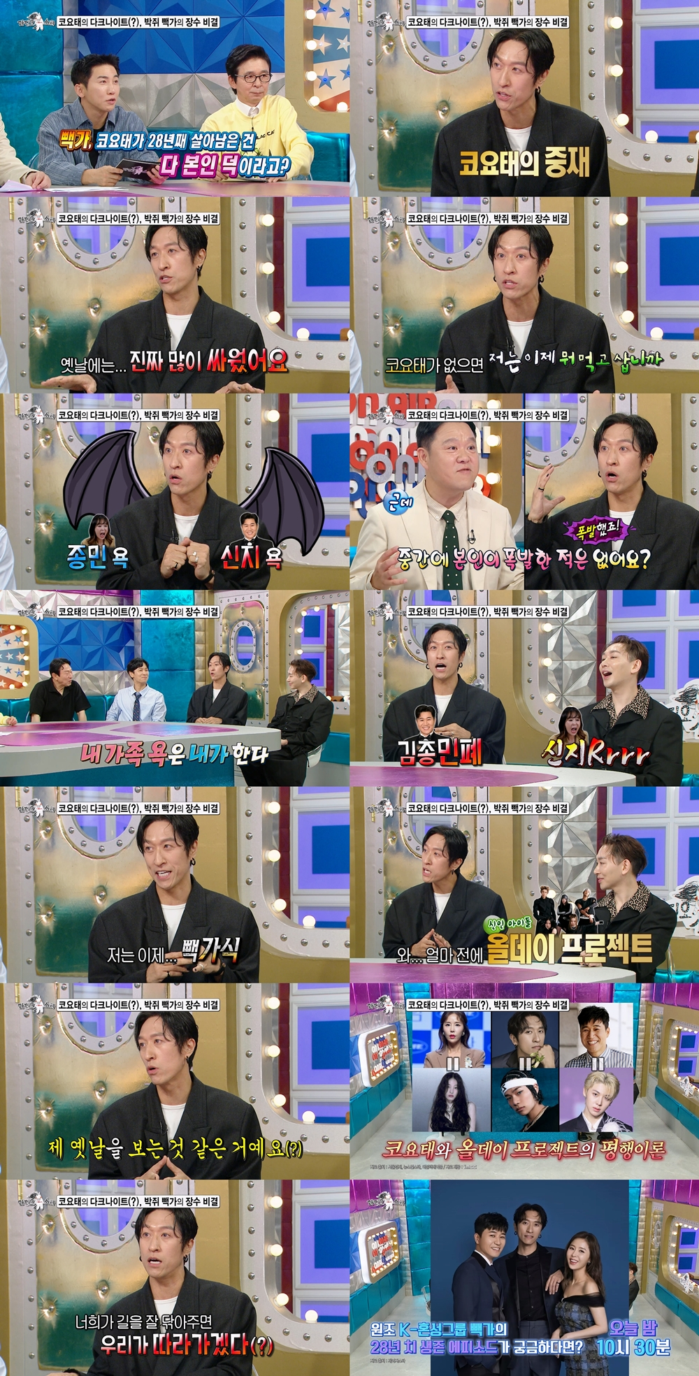 방송에 앞서 공개된 영상에서 MC 유세윤이 "코요태가 28년째 살아남은 건 다 본인 덕이라고?"라고 질문하자, 빽가는 한 치의 고민도 없이 "그런 부분이 좀 있다"라며 답한다. 그는 소개 멘트를 할 때도 "코요태의 중재를 맡고 있습니다"고 말한다고.
