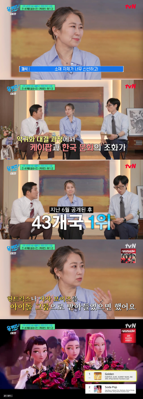 27일 방송된 tvN 예능 프로그램 '유 퀴즈 온 더 블럭'에는 넷플릭스 애니메이션 영화 '케이팝 데몬 헌터스'(이하 '케데헌')를 연출한 매기 강 감독이 출연했다. '케데헌'은 한국을 배경으로 걸 그룹 헌트릭스가 악귀로부터 세상을 지키는 내용을 그린 애니메이션 영화다.