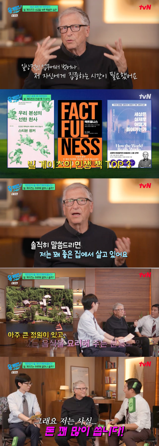 유재석은 "책을 추천해달라"고 물었고, 빌 게이츠는 "내게 많은 영향을 준 책 세 권이 있다"면서 스티븐 핑거의 '우리 본성의 선한 천사', 한스 로슬링의 '팩트풀니스', 바츨라프 스밀의 '세상은 실제로 어떻게 굴러가는가'를 추천했다.