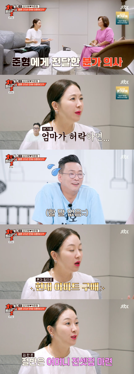 28일 방송된 JTBC 예능 프로그램 '1호가 될 순 없어'에서는 김지혜, 박준형 부부가 결혼 21년 만에 이혼 체험에 나선 모습이 그려졌다.