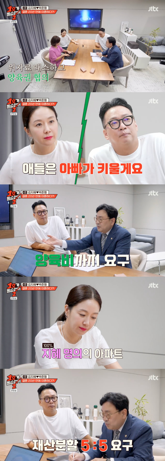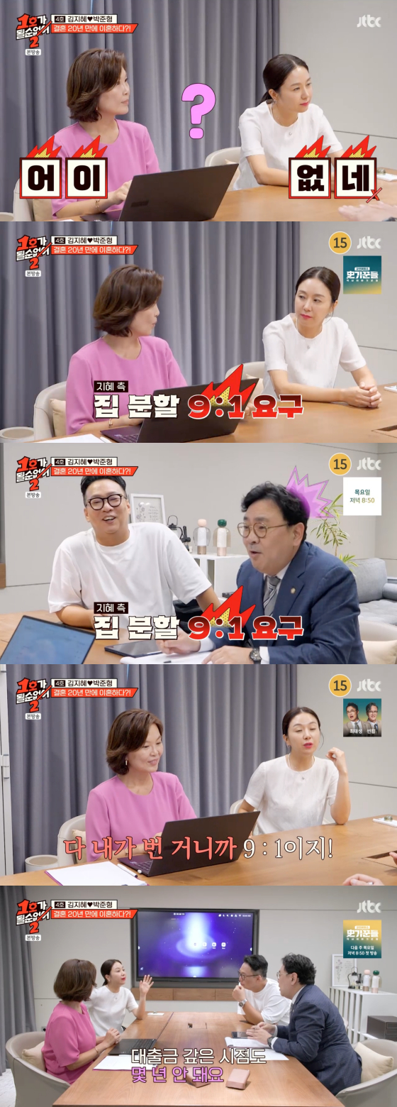 박준형은 재산 분할도 5:5를 주장했고, 김지혜 측 변호인은 "방배동 신혼집을 처분한 대금이 있더라. 그것까지 생각해서 현재 집 재산분할의 경우 9:1을 요구한다"고 전혀 다른 분할 비율을 내놨다.