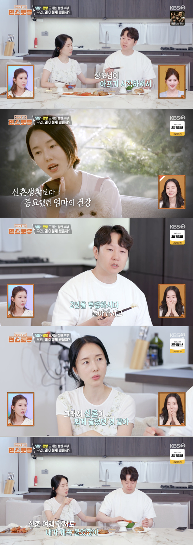 특히 남편은 신혼 초반 겪었던 큰 시련을 고백했다. 그는 "신혼 2년 동안 사건의 연속이었다. 결혼하고 바로 다음 달에 장모님이 아프기 시작하셨다. 그리고 2년을 투병하시다가 돌아가셨다"라고 전했다. 이정현은 이를 떠올리며 "신혼이 슬펐던 것 같다. 신혼여행 가서도 내가 계속 울었다"라고 눈물을 보였다.