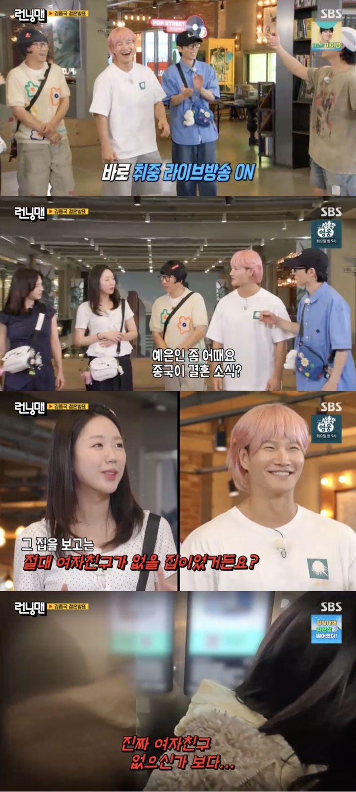 31일 방송된 SBS 예능 프로그램 '런닝맨'에서는 김종국이 깜짝 결혼 소식을 발표한 뒤 멤버들과 솔직한 대화를 나누는 장면이 그려졌다.