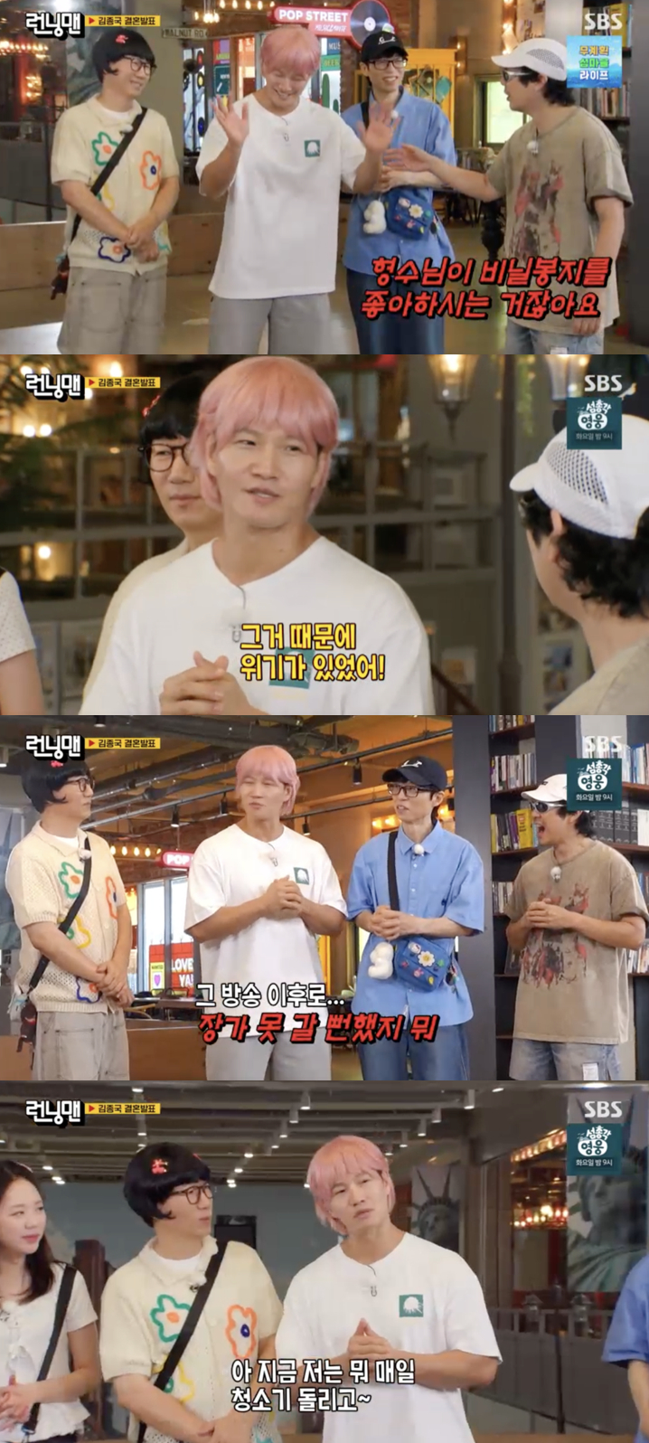 이에 하하는 "형수님은 비닐봉지를 좋아하시는 거잖아요"라며 웃음을 터뜨렸고, 김종국은 즉각 "그거 때문에 위기가 있었다. 방송 이후로 장가 못 갈 뻔했다. 지금은 매일 청소기 돌린다"라고 고백해 현장을 폭소케 했다.