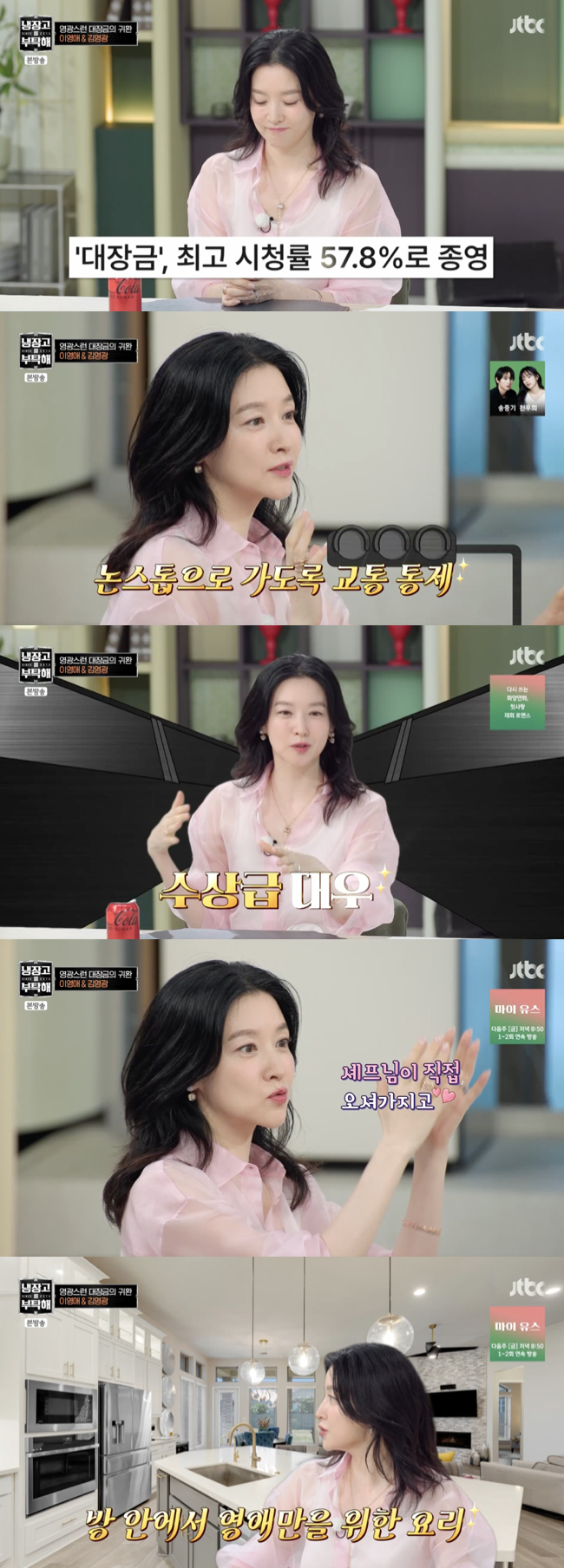 이영애는 이어 '대장금'의 폭발적인 해외 인기에 얽힌 비하인드를 전했다. "국내 시청률 57.8%를 기록했던 '대장금'이 해외에서도 큰 인기를 얻으며 국빈 대접을 받은 적이 있다"라며 당시를 회상했다.