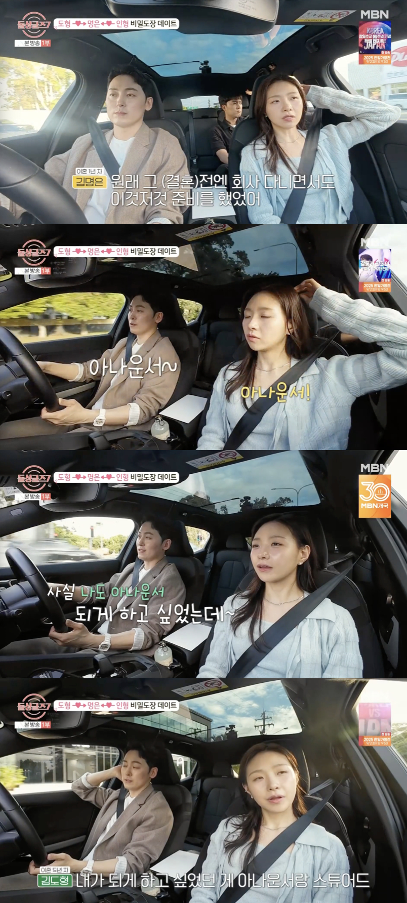 데이트 장소로 이동하던 중 김명은은 대학 시절부터 품어온 꿈을 털어놓았다. 그는 "대학생 때부터 미국 이민을 가고 싶었다"라고 말문을 열며 "원래 그 결혼 전에는 회사 다니면서 이것저것 준비를 했었다. 아나운서"라며 아나운서 준비를 위해 학원을 다녔던 과거를 고백했다.