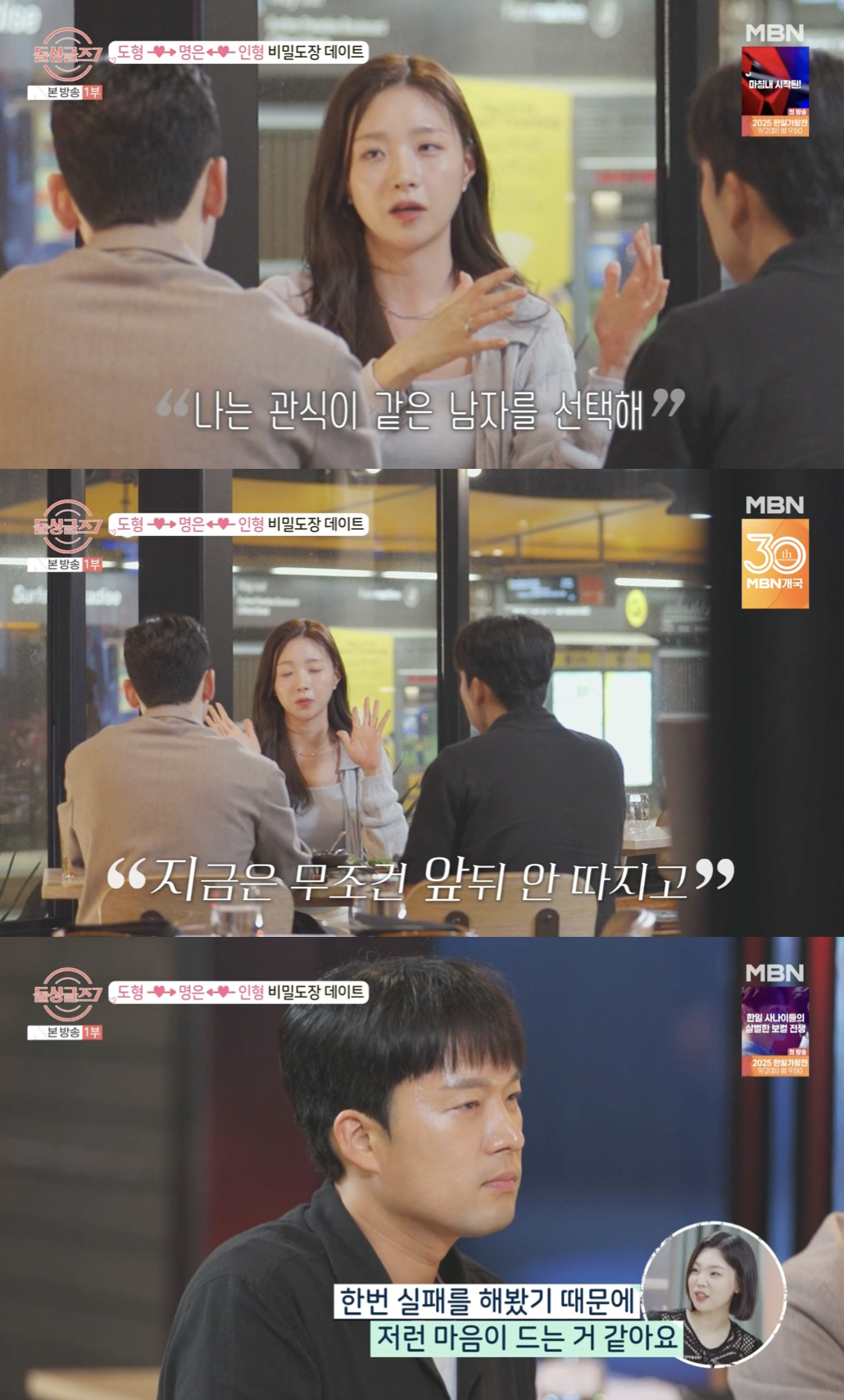 31일 방송된 MBN 연애 예능 프로그램 '돌싱글즈7'에서는 남성 출연자들이 선택한 비밀도장 데이트가 이어졌다. 이날 방송에서는 김도형, 김명은, 김인형의 2대1 데이트 현장이 공개됐다.