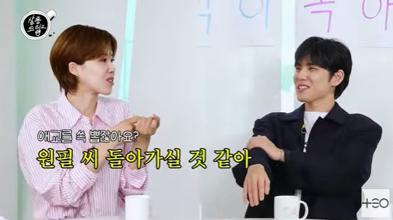 반면 성진은 자리에 앉을 때부터 "아이고, 아이고"라는 곡소리를 내며 아재미를 선보였다. 그는 "제가 의성어를 많이 쓰는 편이다"라고 해명했으나 원필은 "물을 마실 때도 국밥을 먹는 것처럼 소리를 낸다"라고 폭로해 웃음을 안겼다.