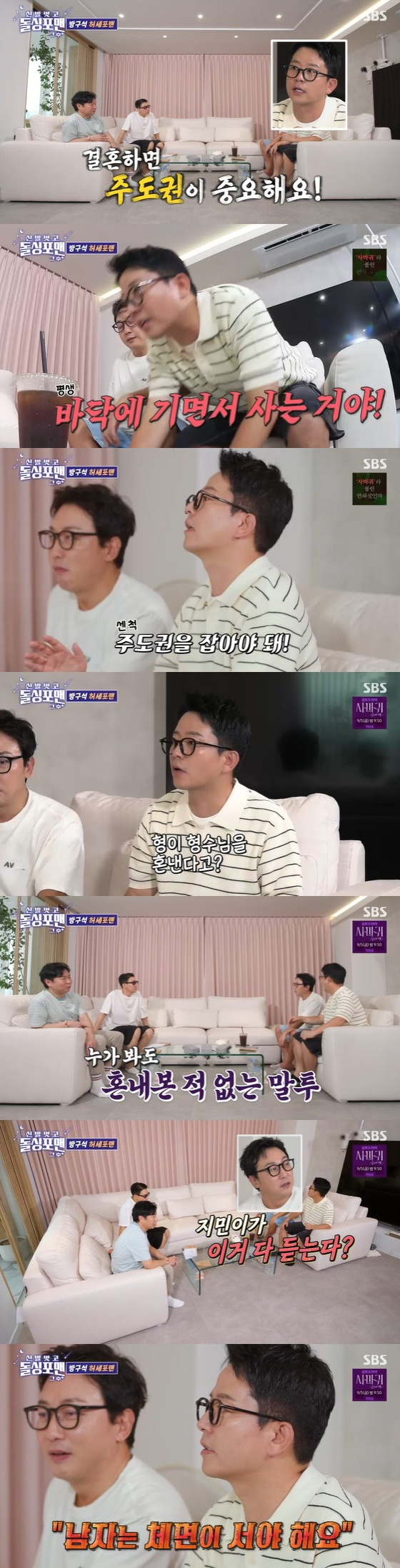 그러자 김준호는 "저는 사나이로서 하고 싶은 대로 한다"라고 큰 소리를 쳤다. 이어 이상민에게 "결혼하면 주도권이 중요하다. 지금부터 이러면 평생 바닥에 기어 다닌다. 박박 질러야 한다"라고 얘기했다.
