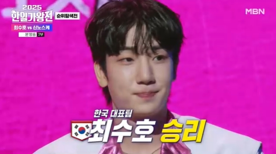 가수 최수호가 일본 국민가수 사이조 히데키의 아들을 꺾고 1승을 거뒀다.