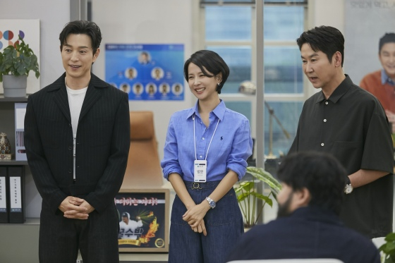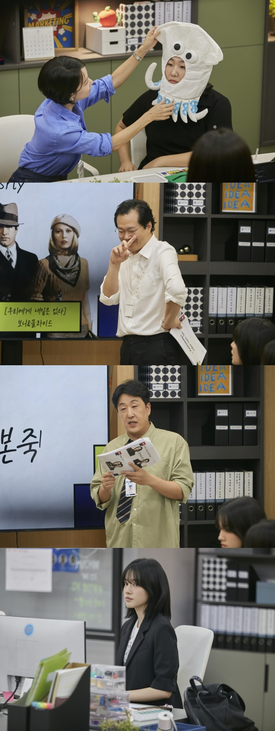 함께 공개된 스틸컷에는 DY기획 직원들 앞에 등장한 조여정과 정성일이 '긴장 반, 설렘 반' 모습이 담겨 어떤 웃음 대결이 있었을지 궁금증을 높인다. 여기에 '우리에게 내일은 없다'라는 제목이 띄어진 PPT 앞에 선 백현진과 수줍게 발표에 나선 현봉식이 포착돼 시선을 끈다.
