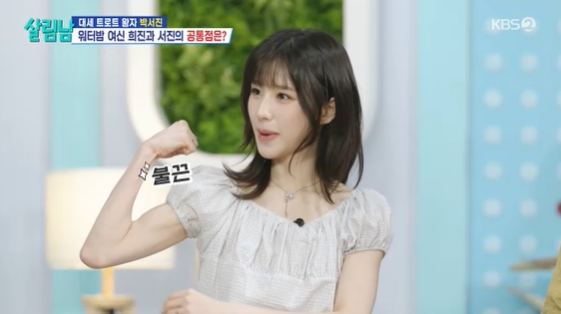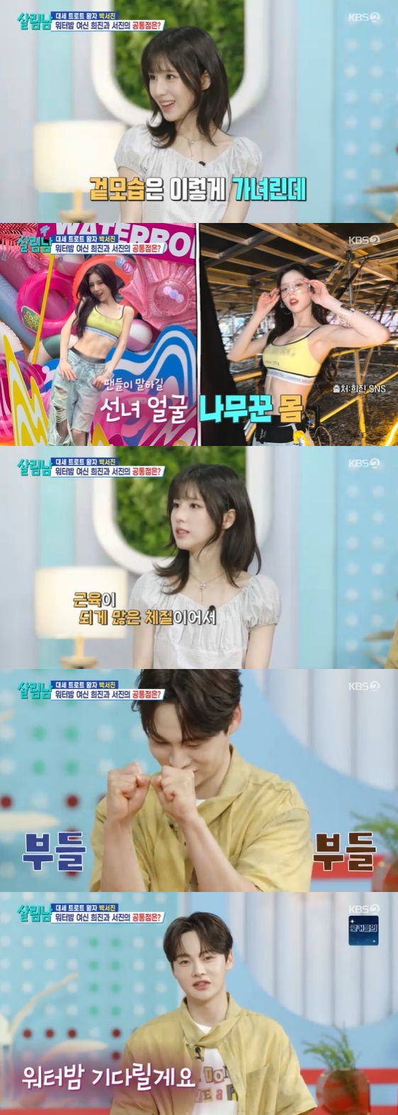 박서진은 "저도 전완근이 있다"라고 허세를 부렸으나 부들부들 떨며 팔근육을 선보여 웃음을 안겼다. 그는 "워터밤 너무 부럽다. 저도 자체적으로 워터밤을 하고 있는데 연락주시면 바로 가겠다"라고 의욕을 보였다.