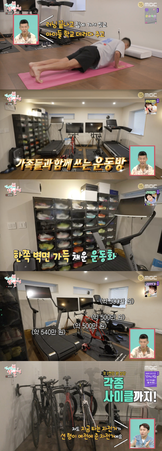 한쪽에는 2000만원대의 사이클과 각종 운동 기구들이 설치돼 있어 웬만한 헬스장을 능가하는 규모를 자랑했다. 션은 "우리 아이들도 비 오면 이곳에서 운동한다"라고 말하며 가족 모두가 운동을 즐기는 모습을 보였다.
