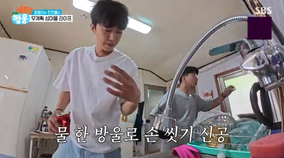 그러나 세 사람은 이내 상황을 받아들이고 절수 모드에 돌입했다. 임태훈은 "덜 쓰고 안 쓰면 된다. 점심엔 씻지 말고 저녁만 씻자"라고 제안했고, 궤도와 임영웅은 물 한 방울로 손을 씻으며 물 절약에 나섰다.