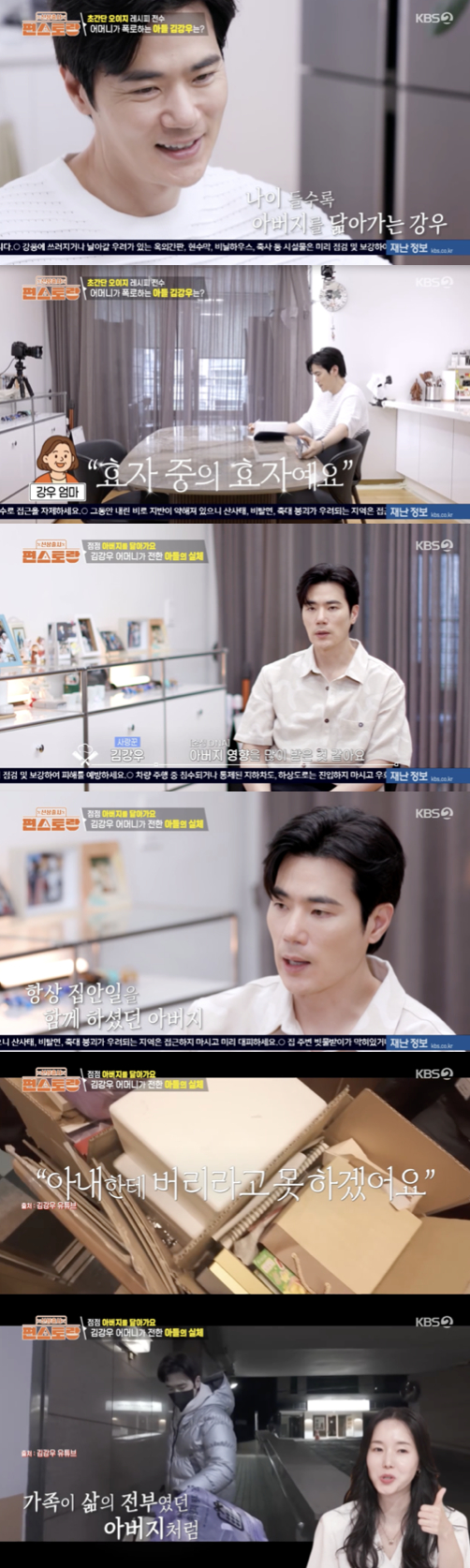 김강우의 모친은 이어 그 다정함이 남편에게서 비롯된 것이라고 밝혔다. 이에 김강우는 "부모님 영향을 많이 받은 것 같다. 술 담배도 안 하시고, 다섯시면 집에 오셨다. 퇴근 후 청소도 같이 하고, 집안일은 남녀구분 없이 같이 했다. 다 그렇게 사는 줄 알았다"라며 자연스럽게 몸에 밴 사랑꾼 DNA를 고백했다.