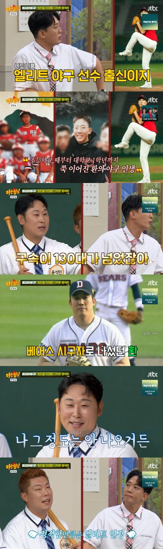 이에 정민철이 못마땅한 표정을 지으며 "엘리트의 정의가 뭐냐"라고 묻자 김환은 야구계 전설들 앞에서 잔뜩 주눅든 표정으로 "초등학교 때부터 대학교 1학년 때까지 쭉 선수 생활을 했다"라고 설명했다.