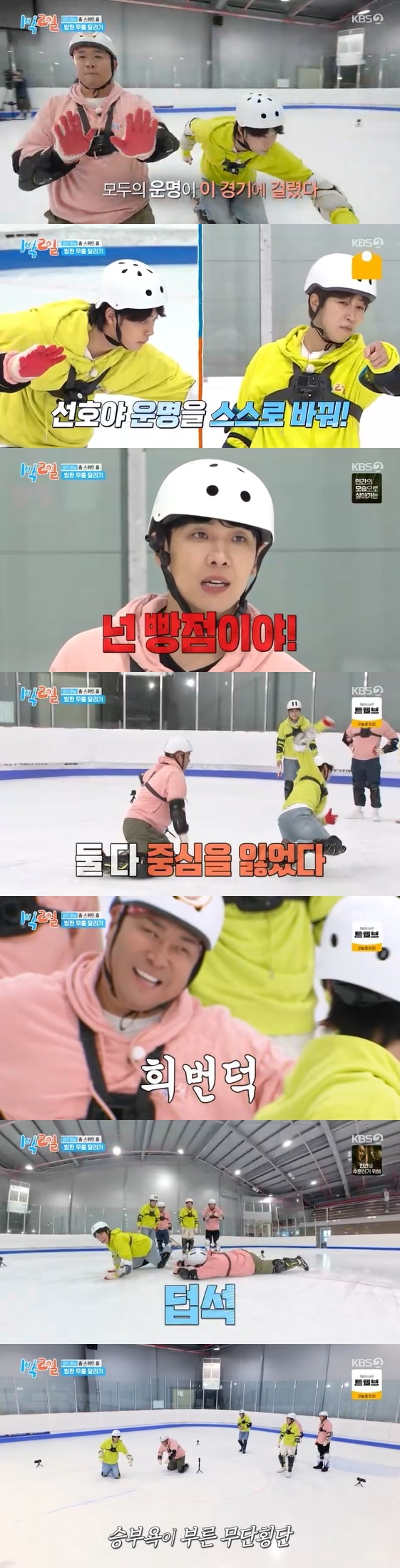 이날 멤버들은 아이스링크장에서 빙판 무릎 달리기 게임을 진행했다. 두 팀으로 나누어진 멤버들이 1대 1로 무승부를 맞은 가운데 마지막 주자인 유선호와 문세윤이 출발선에서 긴장감 넘치는 3라운드 경기를 시작했다.