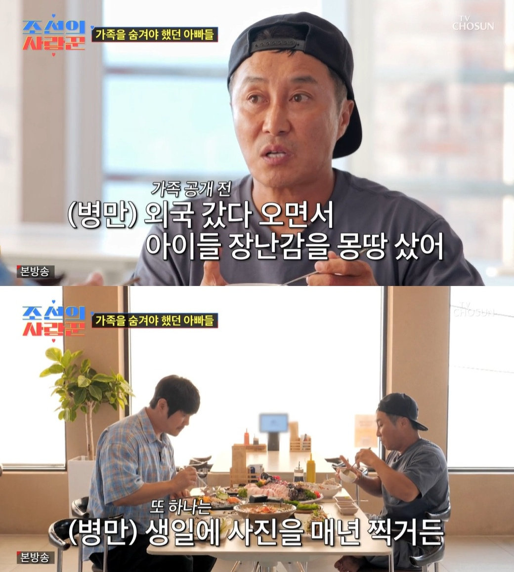 김병만은 KCM에게 육아 비법을 전수 받기 위해 만났다가 자신의 마음을 털어놨다. 그는 "내가 외국 다녀와서 아이들 장난감을 몽땅 샀다. 근데 사람들이 또 물어보지 않을까 싶더라. 스스로 조마조마했다. 생일에 사진을 매년 찍는다. 집에 가족사진을 찍는데 거기에 내가 없다"라고 미안함을 드러냈다.