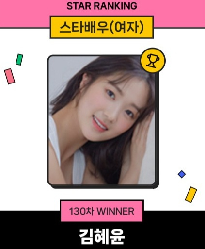 김혜윤은 지난 11일 오후 3시 1분부터 18일 오후 3시까지 진행된 130차 스타랭킹 스타배우 여자 랭킹 투표에서 2만 4099표를 획득하며 1위를 기록했다.