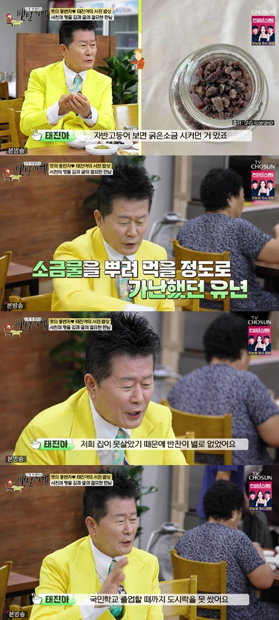 이어 "우리 집에는 양념이 없었다. 자반고등어 보면 굵은 소금 시커먼 거 있지 않나. 그게 제일 싸다. 그걸 묵에 뿌려서 먹었다"고 회상했다.
