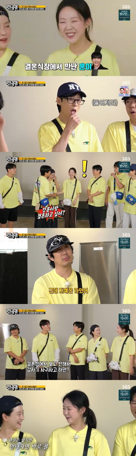 이때 유재석은 결혼식에 참석했던 '임대 멤버' 강훈을 언급하며 "예은이가 몇 번 훔쳐보더라. 처음에 가볍게 인사하고 말았는데 안심 먹으면서 계속 지켜봤다"라고 폭로해 현장을 술렁이게 했다.