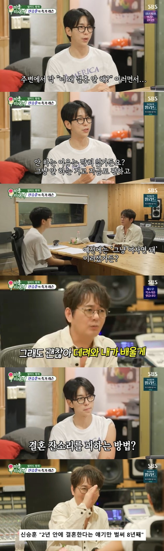 그런가 하면 신승훈은 주위의 결혼 압박을 정면 돌파할 수 있는 특급 비법을 소개해 눈길을 끌었다. 그는 "계속 2년 후라고 얘기해라. 2년 후에 계획하고 있다고 말해라. 내가 16년간 그 방법을 쓰고 있다"라고 전해 웃음을 안겼다.