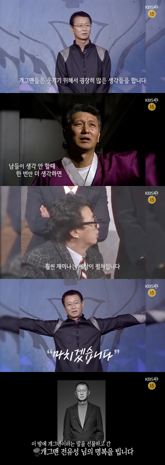 영상이 끝나자 제작진은 '이 땅에 개그맨이라는 말을 선물하고 간 개그맨 전유성 님의 명복을 빕니다'라는 자막을 삽입해 보는 이들을 먹먹하게 했다.