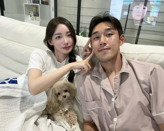 공개된 사진 속 곽민선은 예비 신랑 송민규의 볼을 찌르며 사랑스러운 포즈를 취했다. 두 사람은 선남선녀 비주얼을 뽐냈다.