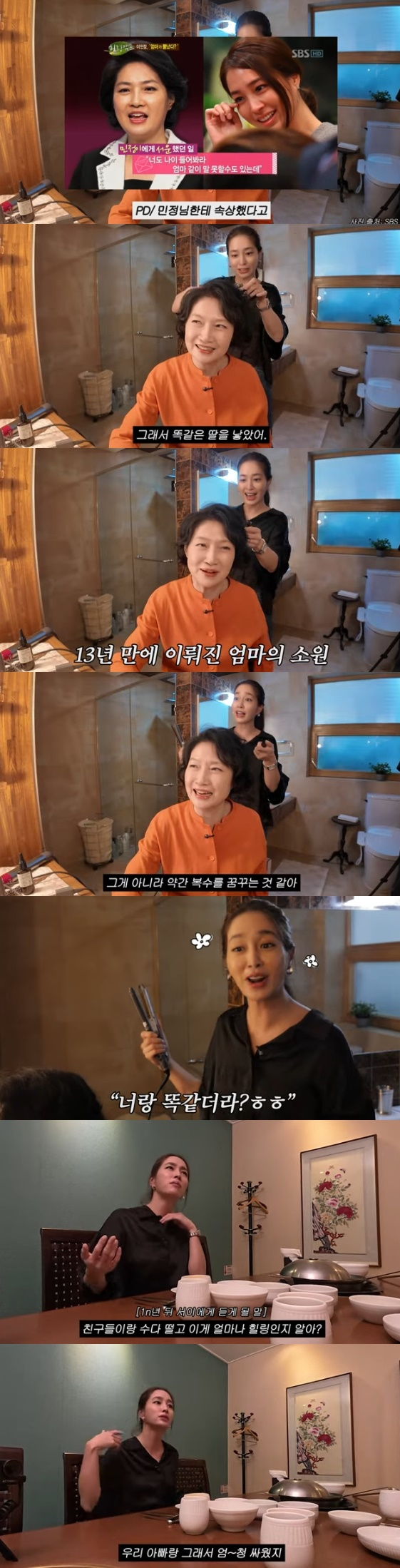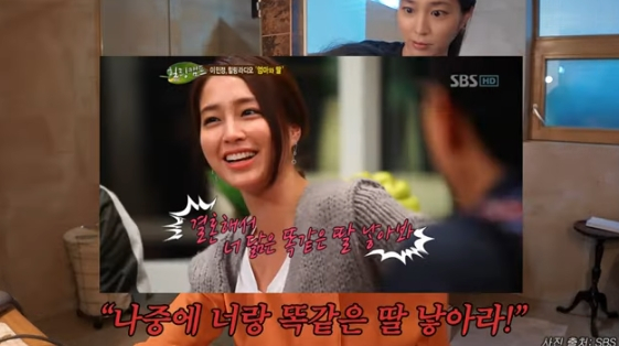 제작진은 또 과거 예능 프로그램 '힐링캠프'에서 이민정의 모친이 "나중에 너랑 똑같은 딸 낳아봐라."라고 속상함을 토로했던 일화를 언급하자 이민정의 어머니는 "손녀 서이가 그런 것 같다. 점점 닮아간다"라고 통쾌한 웃음을 지었다.