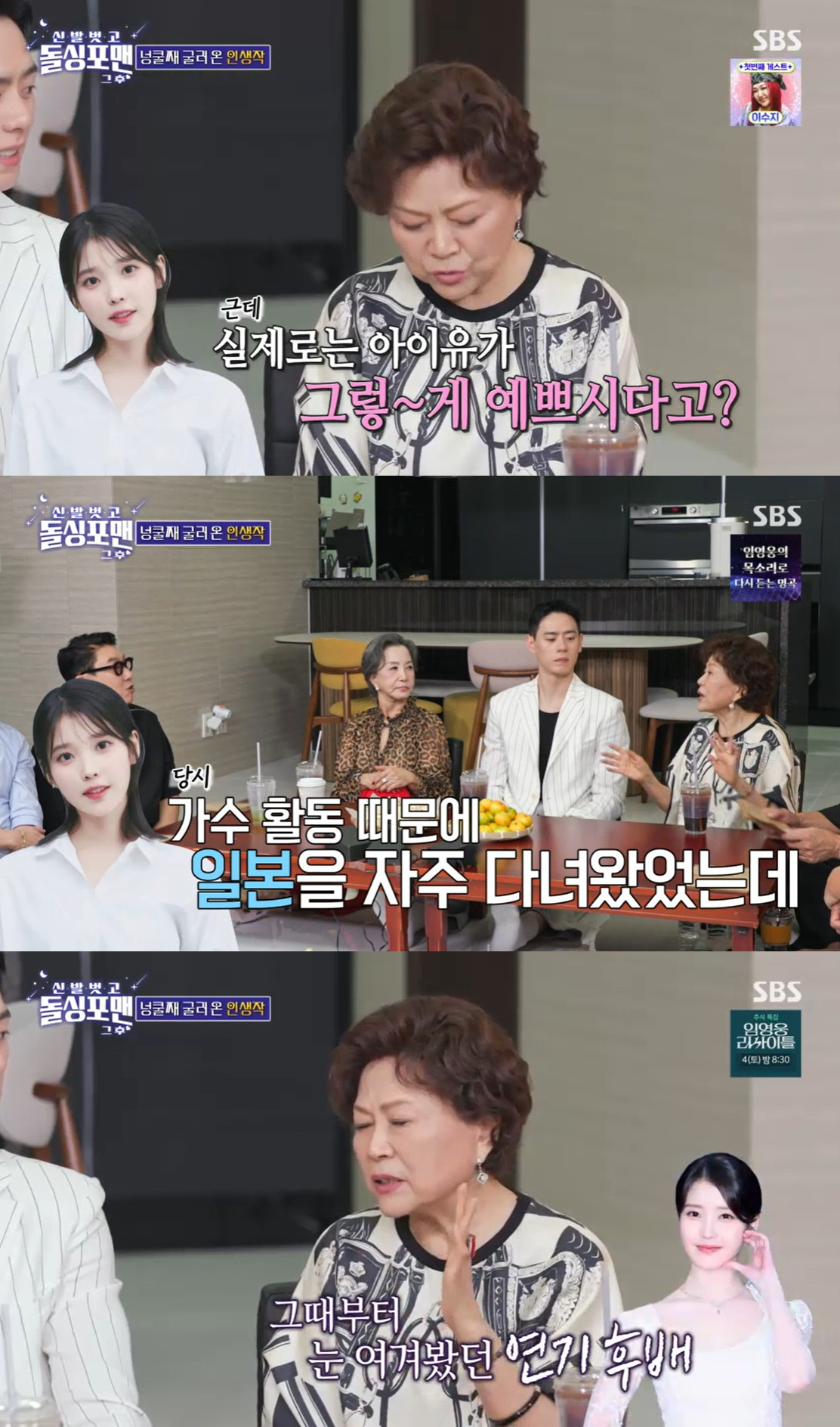 한편 김용림은 아이유에 대한 칭찬을 아끼지 않았다. 그는 "아이유와 인연은 2014년도 드라마 '최고다 이순신'이란 작품을 할 때부터 였다. 가수로만 알고 있었는데 연기도 잘했다. 어른도 잘 안다. 인사도 깎듯하다. 그때 일본을 왔다 갔다 할 때였다. 갔다 오면 하다못해 과자라도 꼭 챙겨줬다. 그런게 눈여겨 지더라"라고 말해 훈훈한 분위기를 만들었다.