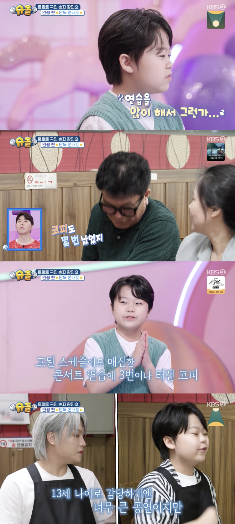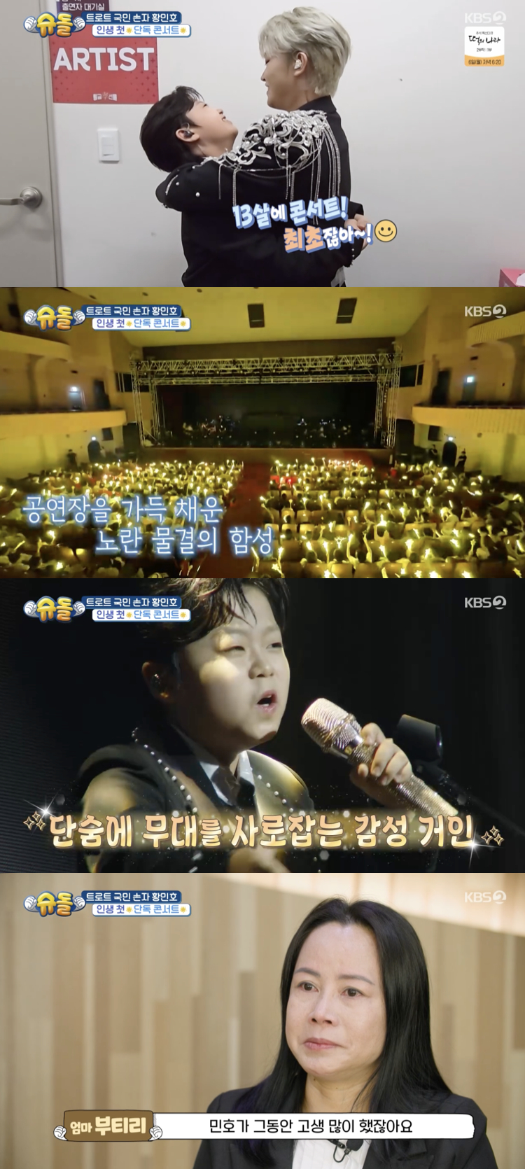 드디어 콘서트 당일, 두 형제는 무대 뒤에서 서로를 꼭 끌어안으며 긴장을 다잡았다. 황민우는 "그래도 13살에 콘서트하는 거 최초 아니냐"라며 동생을 자랑스러워했고, 황민호는 무대에 오르자 어린 소년의 긴장은 온데간데없이 사라졌다. 대신 무대를 압도하는 감성의 거인으로 변신해 관객들을 매료시켰다.