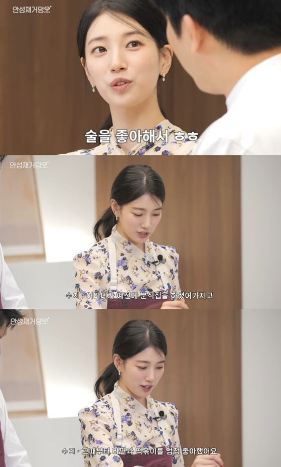 이날 수지는 "술을 좋아해서 평소에 안주를 많이 해 먹는 편이다. 소주 좋아하고 테킬라 좋아한다. 한식도 하고 강된장, 떡국도 만든다"며 요리 실력을 자랑했다.