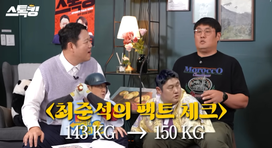 최준석은 "지금 110kg대로 진입했다. 고3 때 100kg를 찍어봤다"라며 "선수 시절 때도 뺐는데 스프링캠프 때 안경현 선배님이랑 운동할 때다. 2008년이다. 빼고 나서 시범경기를 하는데 스윙을 할때 공이 잘 안 날아갔다. 밸런스가 안 맞는 거였다. 그때 117kg까지 뺐었고 이후 감독님께 다시 살을 찌겠다고 했더니 혼났었다. 그래도 결국 쪄서 130kg까지 늘어났다"라고 말했다.