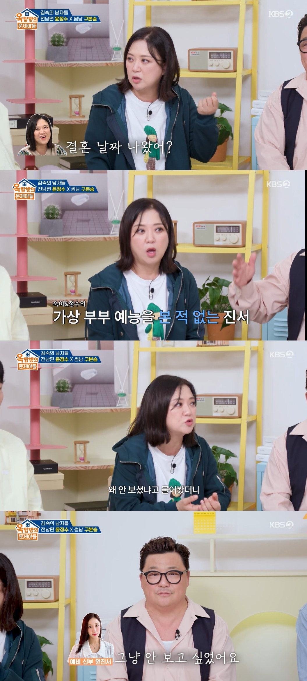 윤정수는 오는 11월 12세 연하 원진서(구 원자현) 아나운서와 결혼한다. 윤정수는 "(예비 신부와) 같이 있을 때 연락해 왔다. '나중에 받아야지' 하고 받으면 이상하지 않나. 보란 듯이 '숙이가 전화 왔네?'라고 했다"라며 "그때 표정도 이상했을 거다. 받자마자 '누구 생겨서 결혼해? 아씨'라고 하더라. 신경질을 냈다. 그렇게 됐다니까 '아이참 5년 더 해 먹어야 하는데'라고 했다. 지금 놓치면 끝장이라고, 그만하라고 했다"라고 털어놨다.