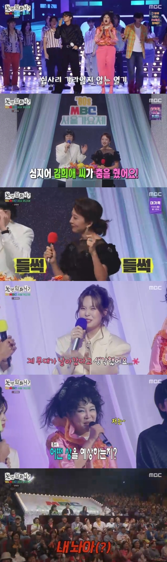 이날 랄랄과 이용진은 서울훼밀리의 '이제는'을 열창하며 강렬한 무대를 선보였다. 신나는 음악과 폭발적인 무대 매너에 관객들은 자리에서 일어나 몸을 흔들었고, 김희애 역시 몸을 들썩이며 무대를 즐겼다.