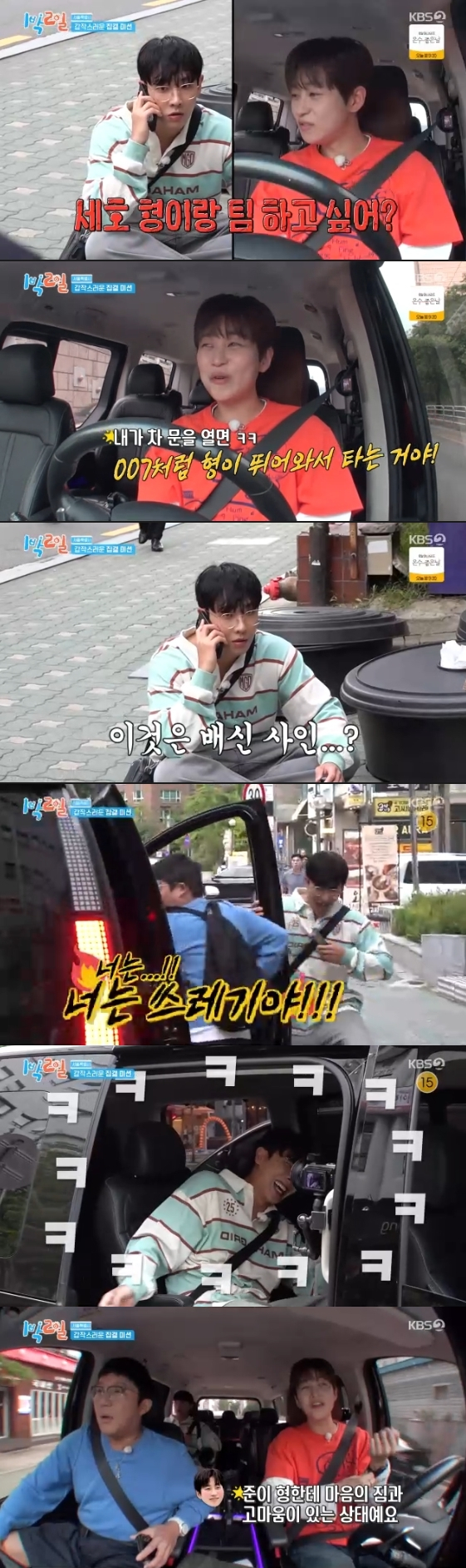 이에 이준은 목소리를 낮추며 "너 지금 차에 누구 있니?"라고 비밀스러운 동맹을 맺었다. 두 사람의 대화를 지켜보던 조세호는 "둘이 지금 무슨 대화를 하는 거냐. 배신때리는 거지?라"며 불안한 표정을 지었다.