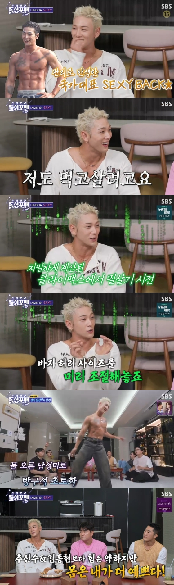 이에 백호는 추신수와 김동현을 가리키며 "두 분은 강해지려고 운동하는데 저는 남들 피부과 가는 시간에 미용으로 헬스장에 간다"라고 말해 현장을 술렁이게 했다. 이에 이상민은 "미용학적으로 식스팩을 일정하게 맞추는 거다"라고 설명했고, 백호는 "먹고 살려고 몸 관리한다"라고 솔직하게 털어놔 모두를 폭소케 했다.