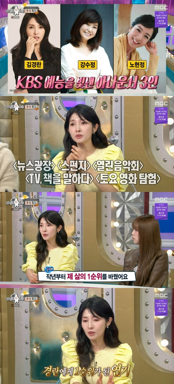 '라디오스타'에서 방송인 겸 연극배우 김경란이 KBS 아나운서 시절을 떠올렸다.