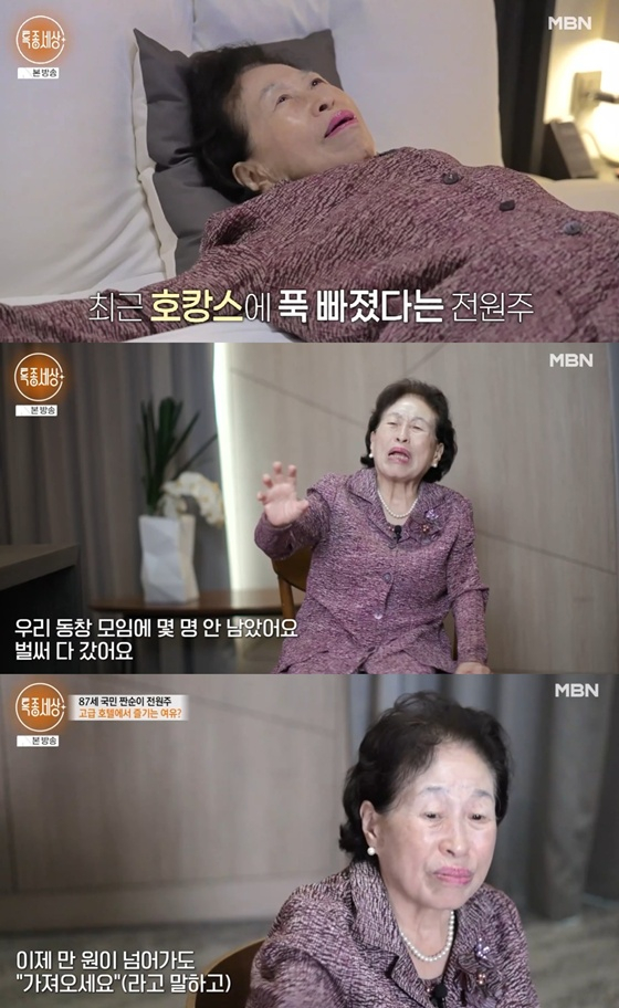 이날 연예계 대표 짠순이로 알려진 전원주는 호캉스에 빠진 근황이 공개됐다. 그는 "동창 모임에 몇 명 안 남았다. 벌써 다 갔다. 갈 일밖에 안 남았다"고 말했다.