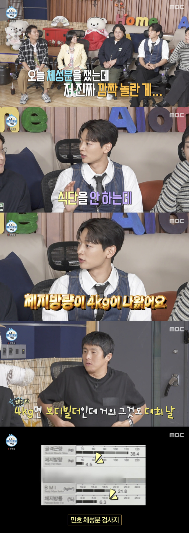 그 가운데 민호는 무지개회원들에게 "제가 오늘 체성분을 쟀는데 깜짝 놀랐다. 제가 식단을 안 한다. 그런데 체지방량이 4kg가 나왔다"라고 밝혀 모두를 놀라게 했다. 이어 "선수들이 대회 나갈 때 프로 보디빌더 대회날 몸"이라며 자신의 몸 상태를 설명해 놀라움을 자아냈다.