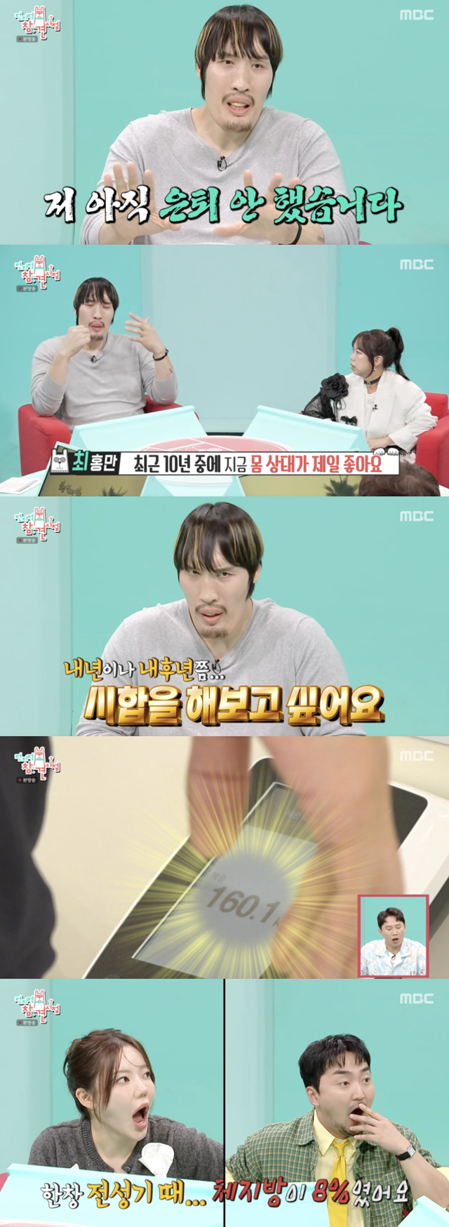 헬스장에 도착한 최홍만은 체중계에 올라 몸무게를 측정했다. 결과는 160kg이었다. 그는 "한창 전성기 때 체지방이 8%였다"라며 자신의 전성기 시절을 회상했다. 이어 공개된 체성분 분석표에는 근육량만 140kg이라는 놀라운 수치가 적혀 있었고, 이를 본 스튜디오는 그야말로 충격에 빠졌다.