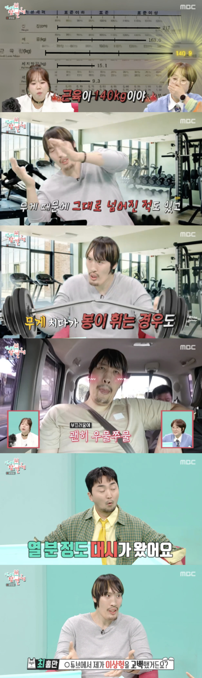 최홍만은 "운동 끝나고 나서 기구에 기대다가 제 무게 때문에 그대로 넘어진 적이 있다. 또 무게 치다가 봉이 휘는 경우도 있다"라며 자신만의 '초대형 운동 에피소드'를 전해 웃음을 자아냈다.