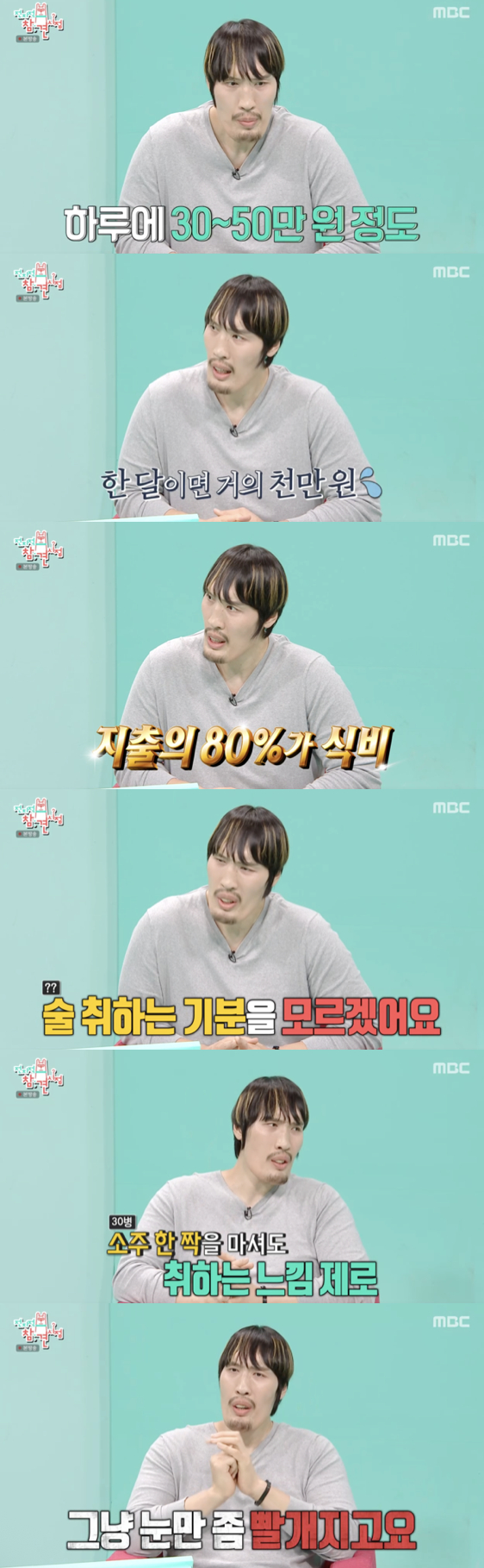 최홍만은 "지출의 80%가 먹는 거에 지출되고 있다. 하루에 30~50만 원 정도 먹는다"라며 "한 달에 천만 원 가까이 식비가 든다"고 털어놔 모두를 놀라게 했다.