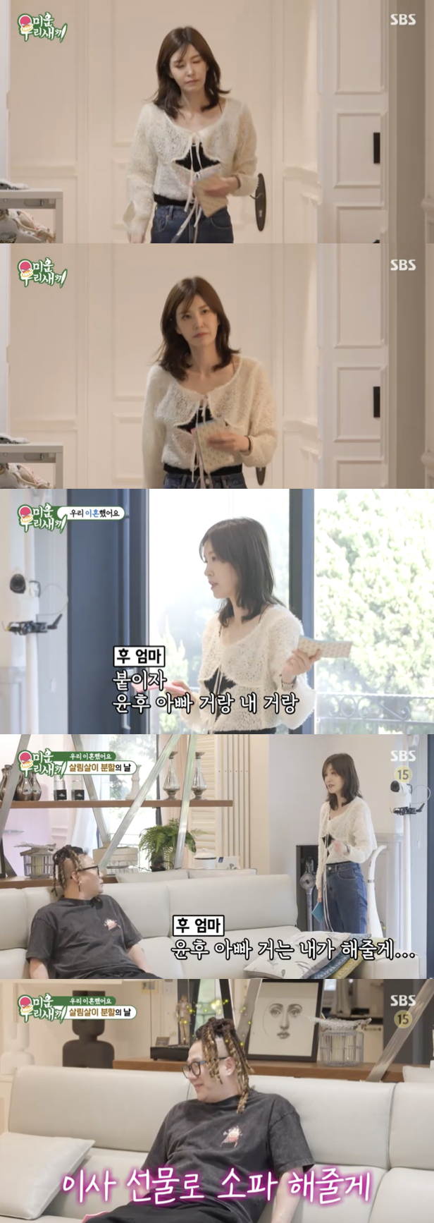 특히 전처는 반려견을 위해 "소파는 두고 가라"고 말했다. 이어 "윤후 아빠 소파는 내가 사주겠다"라며 쿨하고 현실적인 태도를 보였다. 이 장면은 마치 헐리우드의 세련된 전 부부처럼 성숙한 관계를 보여주는 듯했다.