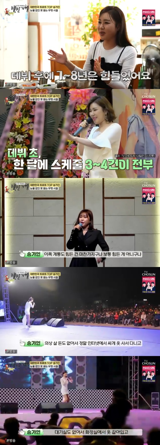 하지만 그는 데뷔 후 오랜 무명 시절을 겪었다고 털어놨다. 송가인은 "데뷔하고 나서 7~8년은 힘들었다"며 데뷔 초 한 달에 스케줄 3~4건이 전부였다고 전했다.
