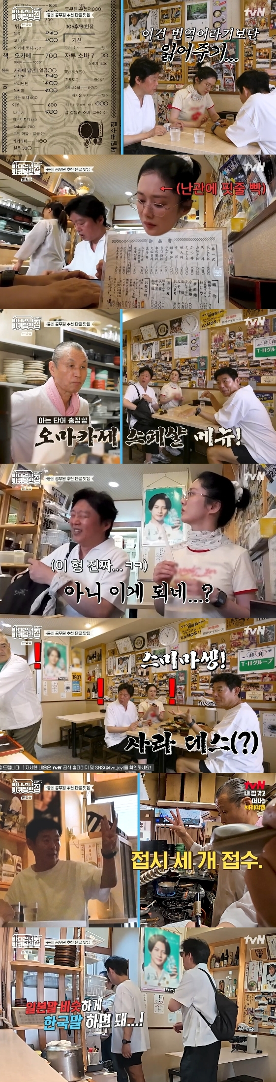 이날 일본에 도착한 세 사람은 성동일의 기지로 찾아낸 현지 공무원들의 단골 식당을 방문했다. 현지인 맛집답게 메뉴판에는 일본어가 빼곡했다. 장나라가 휴대폰으로 사진을 찍어 번역기를 돌렸으나 메뉴판을 이해하기는 힘들었다.