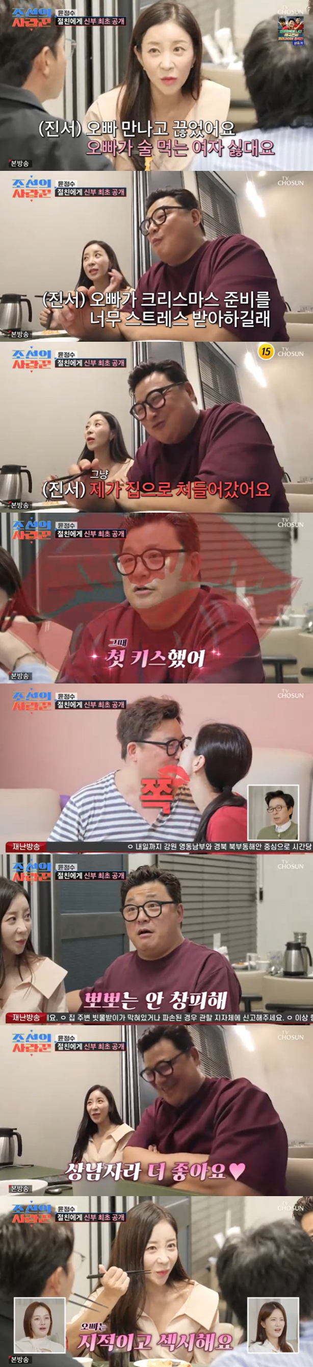 이에 원진서는 "크리스마스 때 썸이었는데 오빠가 이벤트 준비에 스트레스 받는 것 같길래 내가 이브에 집에 쳐들어갔다"라고 했고, 윤정수는 "그때 첫 키스했어"라고 밝혔다. 원진서는 "사귀기 전에도 두 번째 봤을 때 오빠가 이마에 뽀뽀를 했다"고 했다.