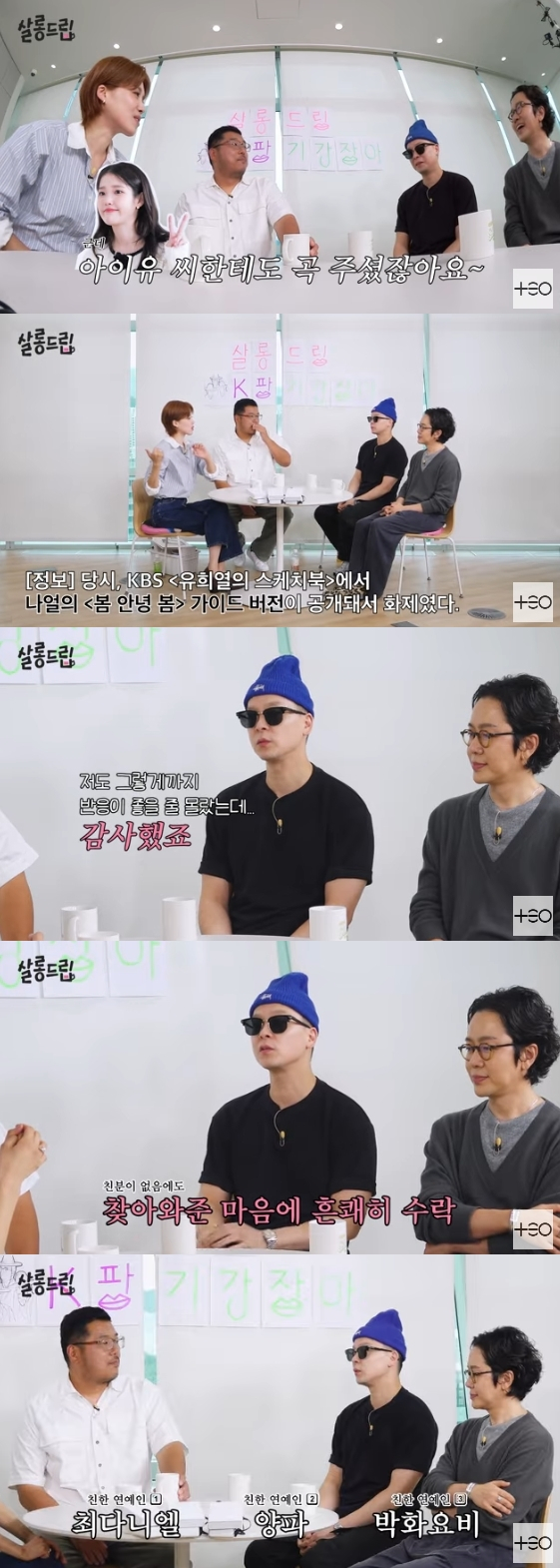 장도연은 나얼이 아이유에게 '봄 안녕 봄'을 선물한 것을 언급하며 "아이유 씨에게 곡을 주시지 않았나. 곡을 주신 것도 화제인데 가이드까지 했다"라고 입을 열었다. 나얼은 당시 KBS '유희열의 스케치북'에서 '봄 안녕 봄'의 가이드 버전을 공개해 화제를 모은 바 있다.