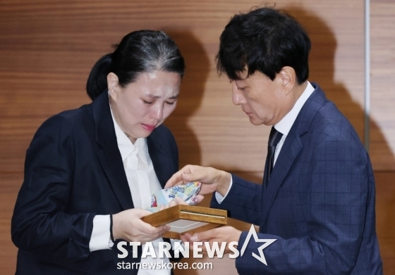이날 현장에서 MBC 안형준 사장과 고 오요안나 어머니 장연미 씨는 합의문 서명과 함께 명예 사원증을 수여했다. 장씨는 안형준 사장과 포옹하며 눈물을 흘렸다.